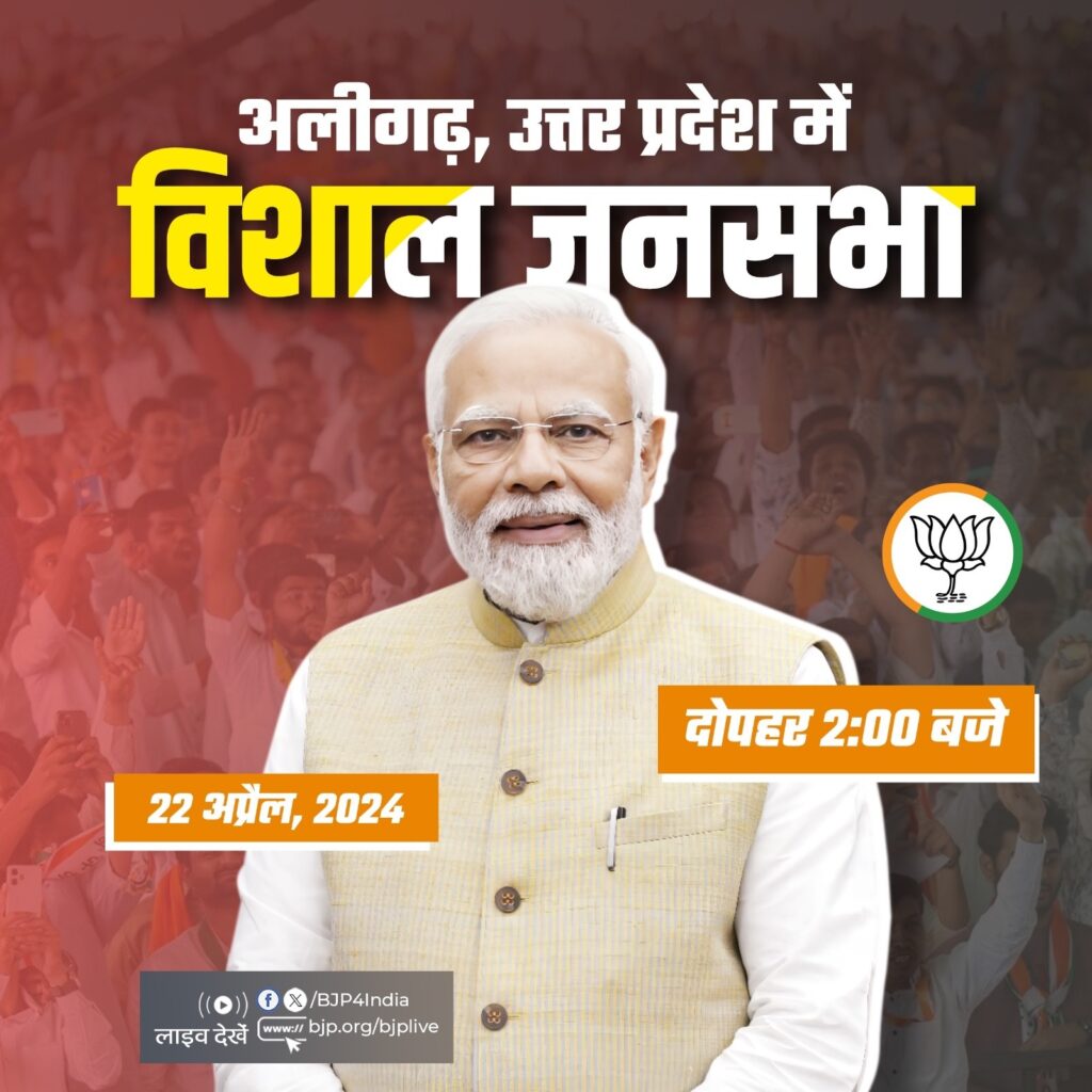नई दिल्ली, 22 अप्रैल । भारतीय जनता पार्टी (भाजपा) के शीर्ष नेता और प्रधानमंत्री नरेन्द्र मोदी लोकसभा चुनाव के दूसरे चरण के रण में पार्टी उम्मीदवारों के समर्थन में जमकर प्रचार कर रहे हैं। वो आज उत्तर प्रदेश के अलीगढ़ में भाजपा की विशाल जनसभा को संबोधित करेंगे। भारतीय जनता पार्टी ने अपने शीर्ष प्रचारक प्रधानमंत्री नरेन्द्र मोदी के आज के चुनाव दौरे का संक्षिप्त विवरण एक्स हैंडल पर साझा किया है।