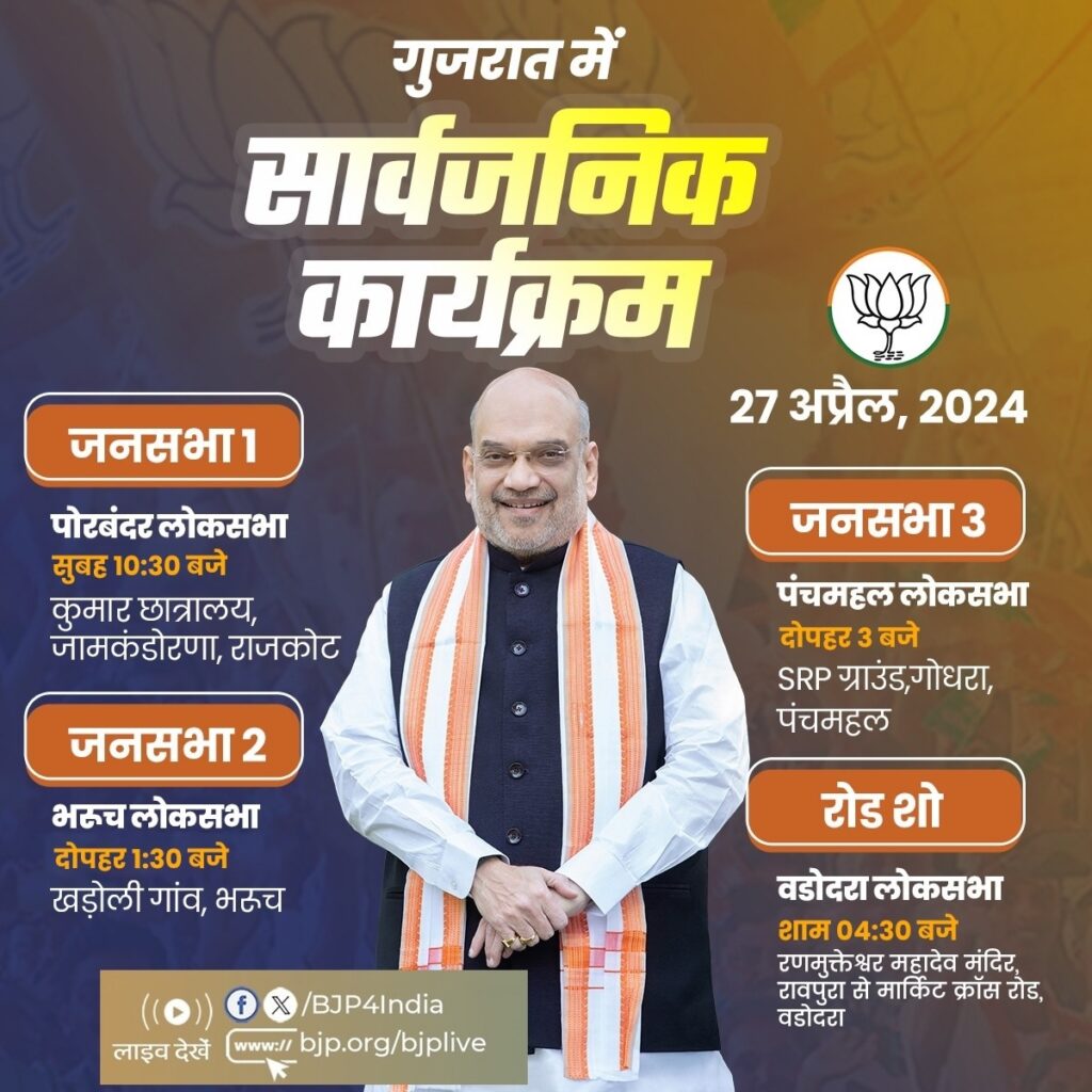 भाजपा के एक्स हैंडल के अनुसार भाजपा की पहली जनसभा पोरबंदर लोकसभा क्षेत्र के कुमार छात्रालय में सुबह 10ः30 बजे, दूसरी जनसभा भरूच लोकसभा क्षेत्र के खड़ोली गांव में दोपहर 1ः30 बजे और तीसरी जनसभा पंचमहल लोकसभा क्षेत्र में गोधरा के एसआरपी ग्राउंड में दोपहर 3ः00 बजे होगी। भाजपा के वरिष्ठ नेता शाह इन तीनों जनसभाओं को संबोधित करेंगे। आखिर में शाम को वो वडोदरा लोकसभा क्षेत्र में प्रचार करेंगे। वो शाम 4ः30 बजे रोड शो में शामिल होंगे। इसकी शुरुआत रणमुक्तेश्वर महादेव मंदिर रावपुरा से होगी। इसका समापन मार्केट क्रास रोड पर होगा।
