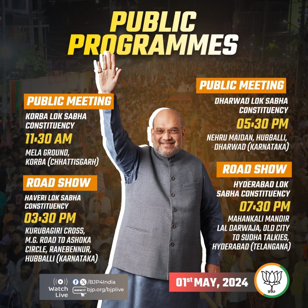 नई दिल्ली, 01 मई । भारतीय जनता पार्टी (भाजपा) के वरिष्ठ नेता, स्टार प्रचारक और केंद्रीय गृहमंत्री अमित शाह आज छत्तीसगढ़, कर्नाटक और तेलंगाना के चुनावी दौरे पर रहेंगे। भाजपा ने एक्स हैंडल पर अमित शाह के चुनाव दौरे का कार्यक्रम साझा किया है।