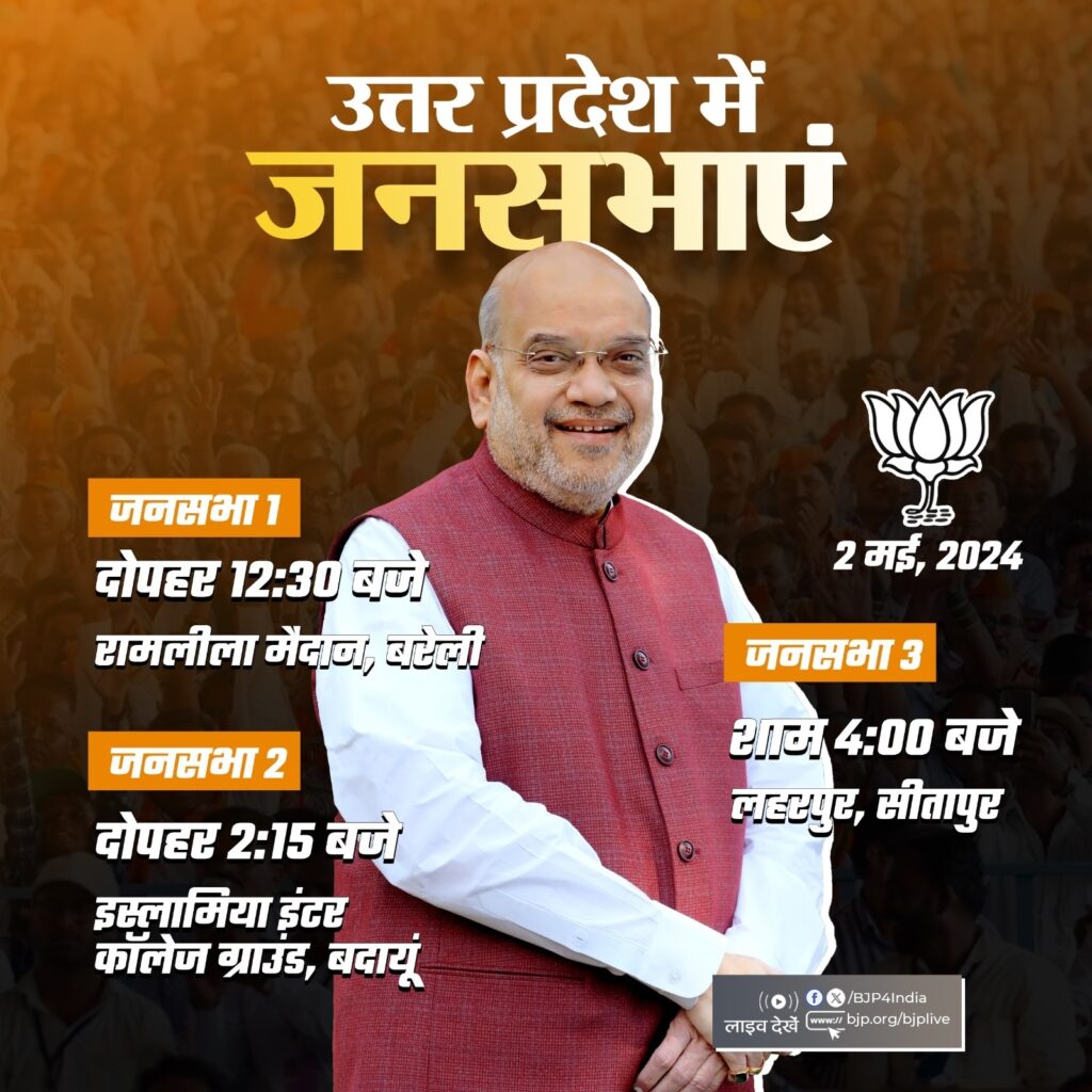 भाजपा के एक्स हैंडल के अनुसार, पार्टी नेता अमित शाह का उत्तर प्रदेश दौरा आज बरेली से शुरू होगा। शाह दोपहर 12ः30 बजे रामलीला मैदान में भाजपा की विशाल जनसभा को संबोधित करेंगे। इसके बाद शाह बदायूं पहुंचेंगे। गृहमंत्री शाह यहां के इस्लामिया इंटर कालेज के ग्राउंड में दोपहर 2ः15 बजे पार्टी की जनसभा में हिस्सा लेंगे। आज उत्तर प्रदेश दौरे के आखिर में वह सीतापुर में जनसभा को संबोधित करेंगे। यह जनसभा शाम चार बजे लहरपुर में होगी।