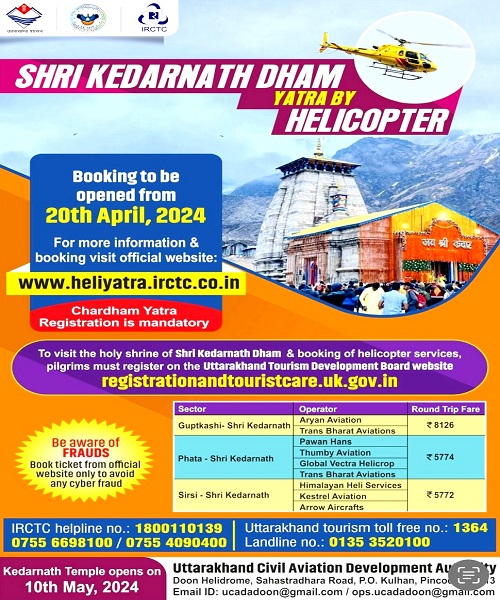 चारधाम के लिए यात्रियों को उत्तराखंड सरकार की युकाडा की ओर से आईआरसीटीसी के साथ अनुबंध कर सहायता प्रदान की जाएगी। युकाडा ने चारधाम से संबंधित पंजीकरण एवं हेलीसेवा के संबंध में सभी जानकारियों के साथ विवरणिका तैयार की है।