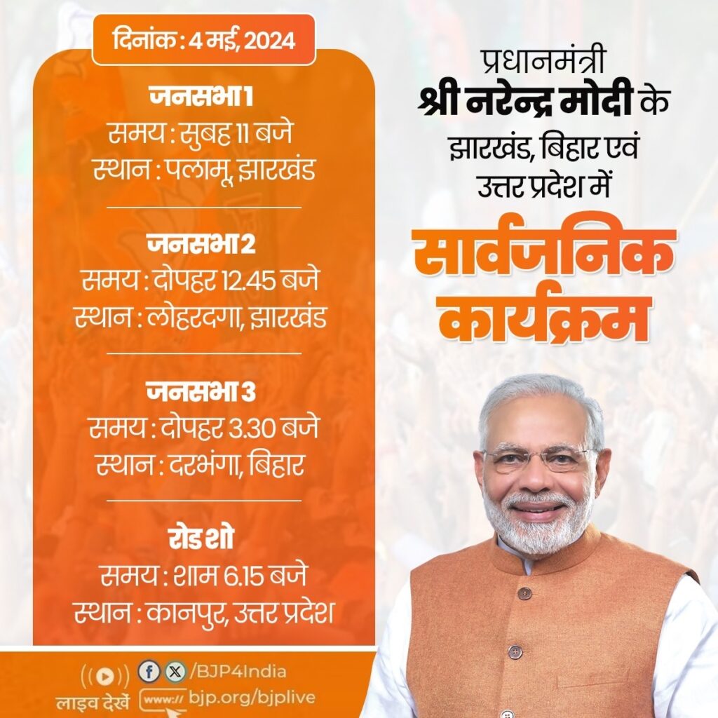 भाजपा के एक्स हैंडल के अनुसार, प्रधानमंत्री मोदी की आज झारखंड के पलामू में सुबह 11 बजे, और दोपहर 12ः45 बजे लोहरदगा में जनसभा होगी। यहां से प्रधानमंत्री बिहार पहुंचेंगे। बिहार के दरभंगा में वो अपराह्न साढ़े तीन बजे जनसभा को संबोधित करेंगे। यहां से प्रधानमंत्री उत्तर प्रदेश के लखनऊ पहुंचेंगे। उल्लेखनीय है कि प्रधानमंत्री नरेन्द्र मोदी इस बार के आम चुनाव में अपने 400 पार के संकल्प की सिद्धि के लिए धुआंधार चुनाव प्रचार कर जनता से आशीर्वाद प्राप्त कर रहे हैं।