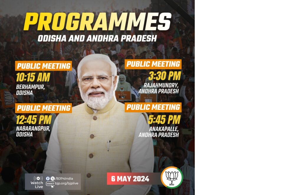 भाजपा के एक्स हैंडल के अनुसार प्रधानमंत्री मोदी आज सबसे पहले ओडिशा में जनसभाओं को संबोधित करेंगे। प्रधानमंत्री मोदी ओडिशा के ब्रह्मपुर में सुबह 10ः15 बजे और नबरंगपुर में दोपहर 12ः45 बजे जनसभा को संबोधित करेंगे। इसके बाद आंध्र प्रदेश के राजमुंदरी में दोपहर साढ़े तीन बजे और शाम पौने छह बजे अनाकापल्ली में चुनाव प्रचार करेंगे।