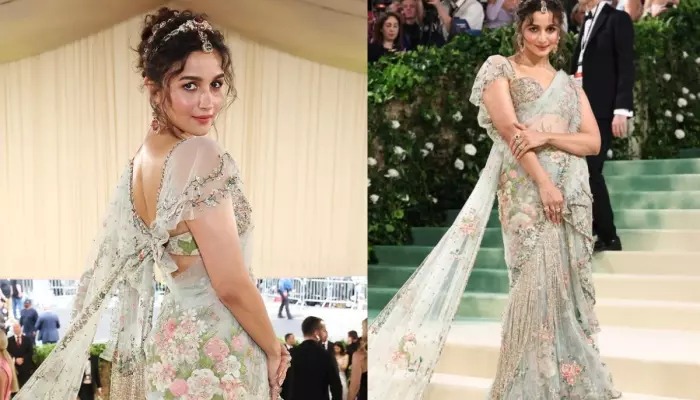 मेट गाला-2024 में आलिया भट्ट ने मिंट ग्रीन कलर की साड़ी पहनकर रैंप वॉक किया। आलिया ने सब्यासाची की डिजाइन की गई साड़ी पहनी थी। इस पर फूल हाथ से सिले गए हैं और पूरी साड़ी हाथ से सिली गई है। इस साड़ी के साथ पहने गए ब्लाउज का गला पीछे से गहरा है और अंत में खूबसूरत धनुष बना हुआ है। इस साड़ी को 163 लोगों ने मिलकर बनाया है। इसे बनाने में कुल 1965 घंटे लगे। सब्यासाची मुखर्जी की टीम ने एक बार फिर बेहतरीन कलाकारी की है।