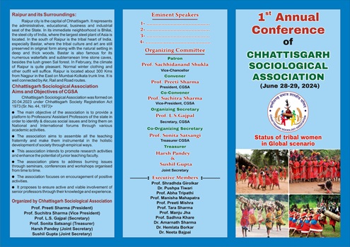 रायपुर । छत्तीसगढ़ समाजशास्त्रीय एसोसिएशन द्वारा अपने पहले वार्षिक सम्मेलन की तैयारी प्रारंभ कर दी गई है। यह प्रथम वार्षिक सम्मेलन वैश्विक परिदृश्य में आदिवासी महिलाओं की स्थिति विषय पर आयोजित किया जा रहा है जिसमें मेजबान छत्तीसगढ़ सहित देशभर के विद्वान, शोधार्थी, प्राध्यापकगण शोध पत्र प्रस्तुत करेंगे। यह जानकारी छत्तीसगढ़ समाजशास्त्रीय एसोसिएशन (सीजीएसए) की अध्यक्ष प्रो. प्रीति शर्मा और सचिव प्रो. एल.एस. गजपाल ने दी। उन्होंने बताया कि आदिवासी महिलाओं का सशक्तिकरण पूरी दुनिया के देशों के विकास की प्रक्रिया में केंद्रीय मुद्दा है। आदिवासी महिलाओं के सशक्तिकरण के उद्देश्य से 28 और 29 जून 2024 को सीजीएसए अपना पहला वार्षिक सम्मेलन उक्त विषय़ पर आयोजित कर रहा है। इस सम्मेलन में छत्तीसग़ढ़ राज्य की जनजातियाँ, वैश्विक समाज में महिलाओं की बदलती स्थिति, आदिवासी महिलाओं की सामाजिक-आर्थिक स्थिति, आदिवासी महिलाओं पर वैश्वीकरण का प्रभाव, आदिवासी महिलाओं के मुददे और चुनौतियाँ, बहुसांस्कृतिकवाद और आदिवासी महिलाएँ, आदिवासी महिलाओं के लिए कल्याणकारी कार्यक्रम जैसे विषयों पर भी शोध पत्र प्रस्तुत किये जाएंगे तथा विषय विशेषज्ञ अपने विचार प्रस्तुत करेंगे। इस आयोजन की सफलता के लिए आयोजन समिति का भी गठन किया गया है जिसके संरक्षक प्रो. सच्चिदानंद शुक्ल (कुलपति पं. रविशंकर शुक्ल विश्वविद्यालय), संयोजक प्रो. प्रीति शर्मा (अध्यक्ष सीजीएसए), सह संयोजक प्रो. सुचित्रा शर्मा (उपाध्यक्ष सीजीएसए), आयोजन सचिव प्रो. एल.एस. गजपाल (सचिव सीजीएसए), सह आयोजन सचिव प्रो. सोनिता सत्संगी (कोषाध्यक्ष सीजीएसए), संयुक्त सचिव हर्ष पाण्डे, सुशील गुप्ता, कार्यकारिणी सदस्य प्रो. श्रद्धा गिरोलकर, डॉ. पुष्पा तिवारी, प्रो. आभा त्रिपाठी, प्रो. मनीषा महापात्र, प्रो. प्रीति मिश्रा, प्रो. तारा शर्मा, प्रो. मंजू झा, प्रो. साधना खरे, डॉ. अमरनाथ शर्मा, डॉ.. हेमलता बोरकर, डॉ.. नीता बाजपेयी शामिल हैं।