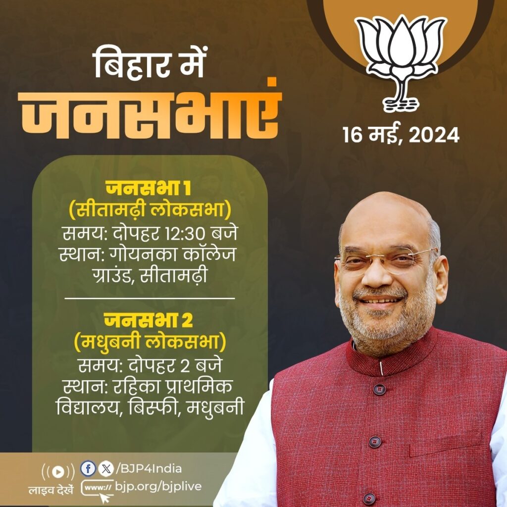 भाजपा के एक्स हैंडल के अनुसार शाह आज सबसे पहले सीतामढ़ी लोकसभा क्षेत्र में चुनाव प्रचार करेंगे। वो दोपहर 12ः30 बजे सीतामढ़ी के गोयनका कॉलेज ग्राउंड में पार्टी की जनसभा को संबोधित करेंगे। यहां से वो मधुबनी लोकसभा क्षेत्र पहुंचेंगे। इस निर्वाचन क्षेत्र में चुनाव प्रचार के दौरान केंद्रीयमंत्री शाह दोपहर दो बजे बिस्फी के रहिका प्राथमिक विद्यालय में भाजपा की जनसभा को संबोधित करेंगे।
