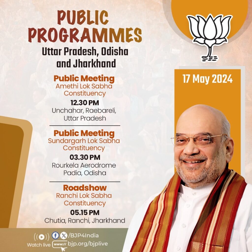भाजपा के एक्स हैंडल के अनुसार शाह आज सबसे पहले अमेठी लोकसभा क्षेत्र में चुनाव प्रचार करेंगे। वो दोपहर 12ः30 बजे ऊंचाहार (रायबरेली) जनसभा को संबोधित करेंगे। यहां से वो ओडिशा पहुंचेंगे। ओडिशा में सुंदरगढ़ के राऊरकेला में जनसभा करने के बाद वो सीधे झारखंड पहुंचेंगे। शाह रांची लोकसभा क्षेत्र में शाम सवा पांच बजे रोड शो करेंगे।