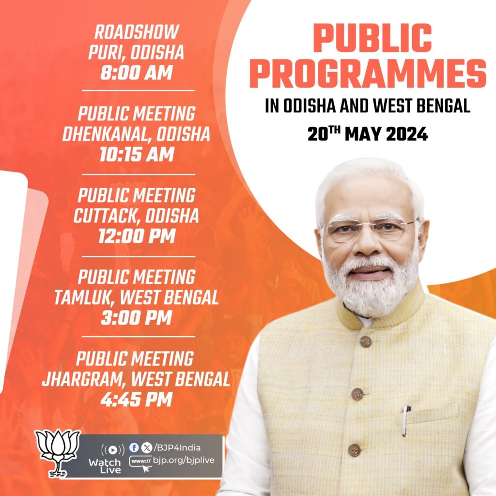 नई दिल्ली, 20 मई । भारतीय जनता पार्टी (भाजपा) के शीर्ष नेता और सबसे बड़े स्टार प्रचारक प्रधानमंत्री नरेन्द्र मोदी आज ओडिशा और पश्चिम बंगाल में चुनाव प्रचार करेंगे। वो आज सुबह ओडिशा के पुरी में रोड शो शुरू करने वाले हैं। भाजपा ने प्रधानमंत्री नरेन्द्र मोदी के आज के चुनावी कार्यक्रम को एक्स हैंडल पर साझा किया है।