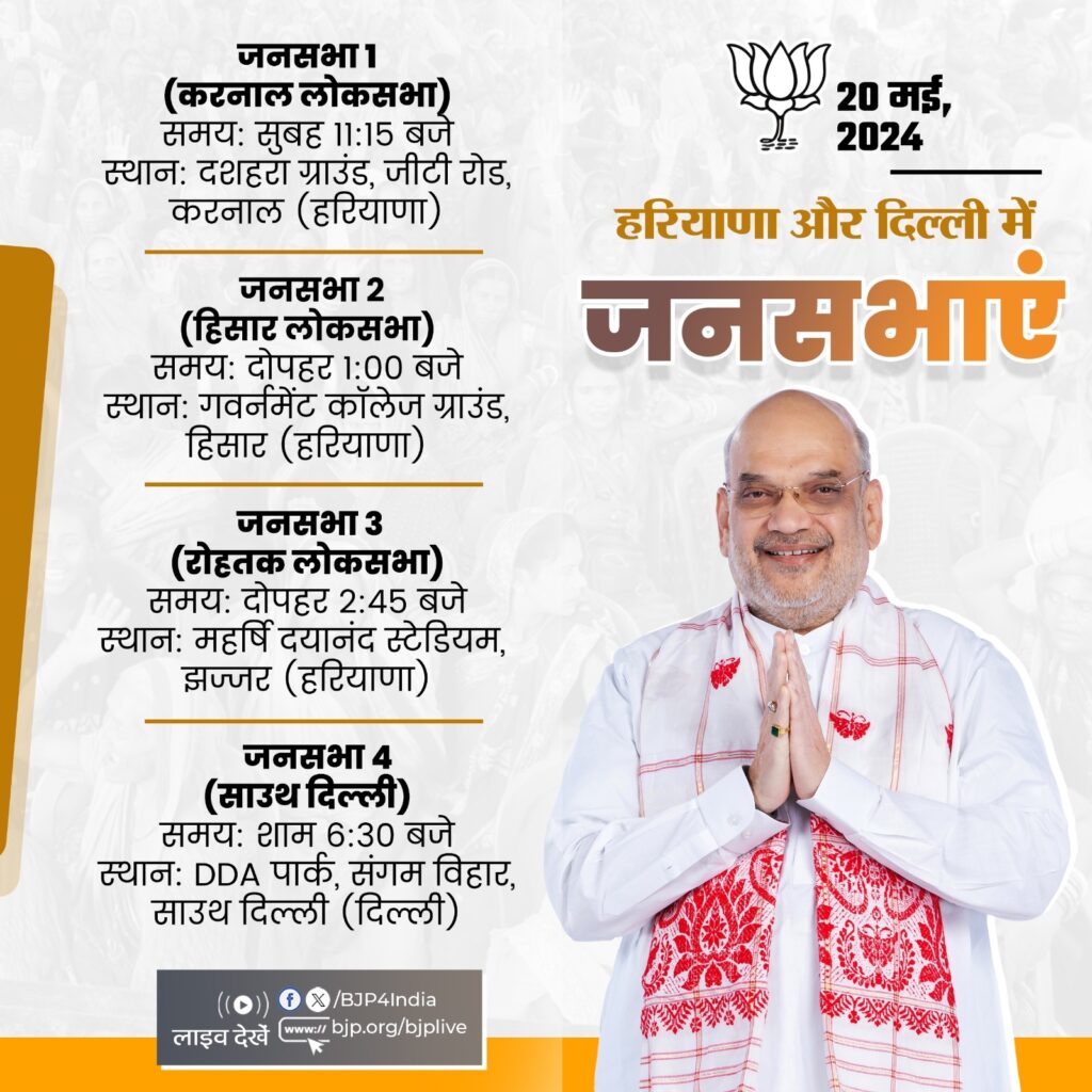 भाजपा के एक्स हैंडल के अनुसार शाह आज सबसे पहले चावल के लिए प्रसिद्ध हरियाणा के करनाल में सुबह सवा 11 बजे जीटी रोड के दशहरा ग्राउंड में पार्टी की जनसभा को संबोधित करेंगे। इसके बाद वो हिसार पहुंचेंगे। यहां दोपहर एक बजे सरकारी कालेज के मैदान जनसभा को संबोधित करने के बाद रोहतक लोकसभा निर्वाचन क्षेत्र में पहुंचेंगे। यहां उनकी जनसभा दोपहर पौने तीन बजे होगी। शाह इस निर्वाचन क्षेत्र के झज्जर स्थित महर्षि दयानंद स्टेडियम में पार्टी उम्मीदवार के पक्ष में जनसभा करेंगे।