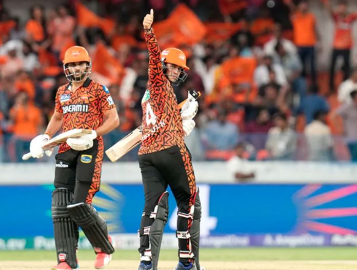बड़े लक्ष्य का पीछा करने उतरी हैदराबाद की शुरुआत खराब रही और ट्रैविस हेड बिना किसी स्कोर के चलते बने, लेकिन इसके बाद अभिषेक शर्मा (28 गेंदों में 66 रन, पांच चौकों और छह छक्के), नीतीश कुमार रेड्डी (25 गेंदों में 37 रन, एक चौका और तीन छक्का), और हेनरिक क्लासेन (26 गेंदों में 42 रन, तीन चौके और दो छक्के) ने आतिशी पारी खेलकर 19.1 ओवर में 6 विकेट पर 215 रन बनाकर जीत हासिल कर ली।