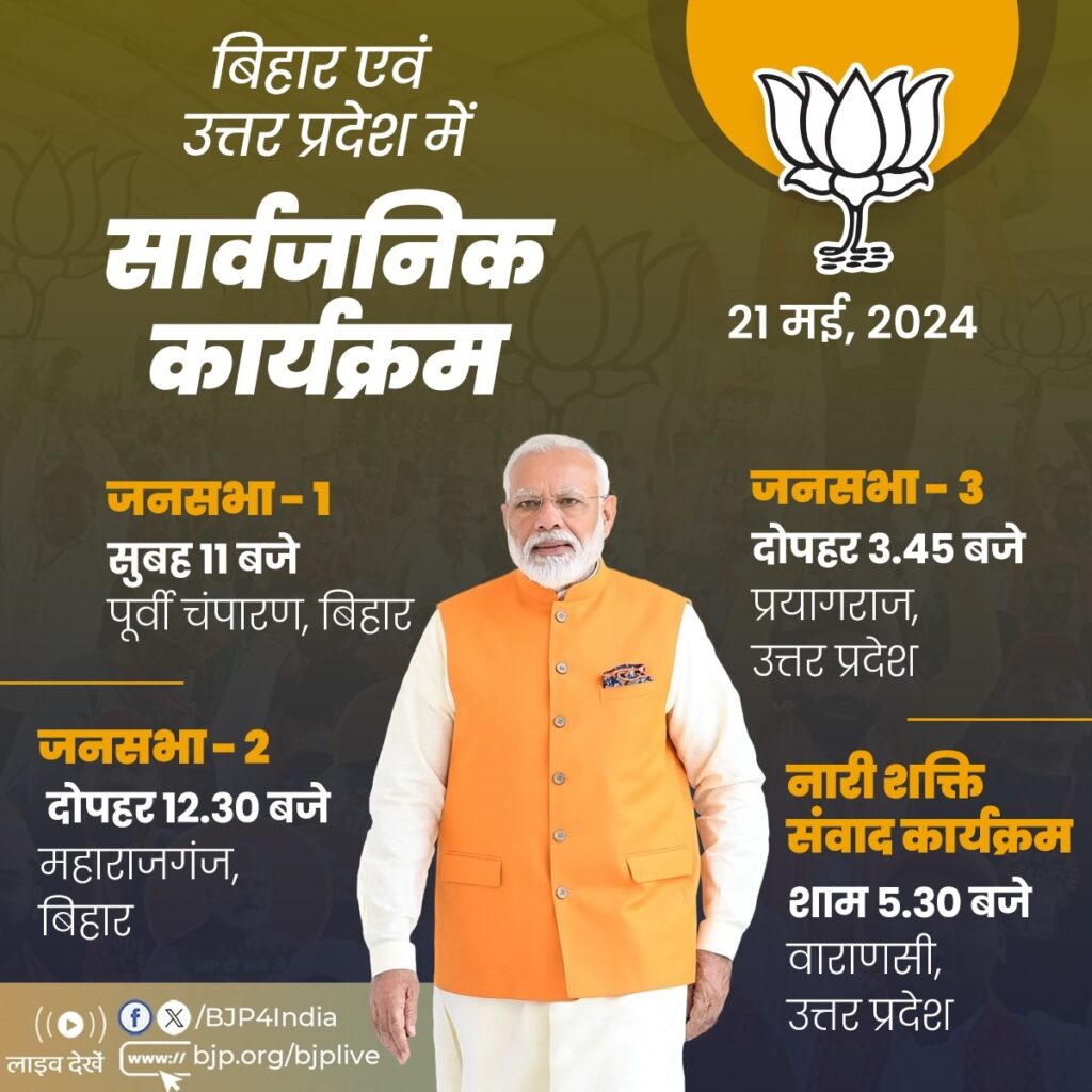 नई दिल्ली, 21 मई । भारतीय जनता पार्टी (भाजपा) के शीर्ष नेता और सबसे बड़े स्टार प्रचारक प्रधानमंत्री नरेन्द्र मोदी आज बिहार और उत्तर प्रदेश में चुनाव प्रचार करेंगे। वो आज सुबह बिहार के पूर्वी चंपारण में जनसभा को संबोधित करने के साथ आज के प्रचार का श्रीगणेश करेंगे। भाजपा ने प्रधानमंत्री नरेन्द्र मोदी के आज के चुनावी कार्यक्रम को एक्स हैंडल पर साझा किया है।