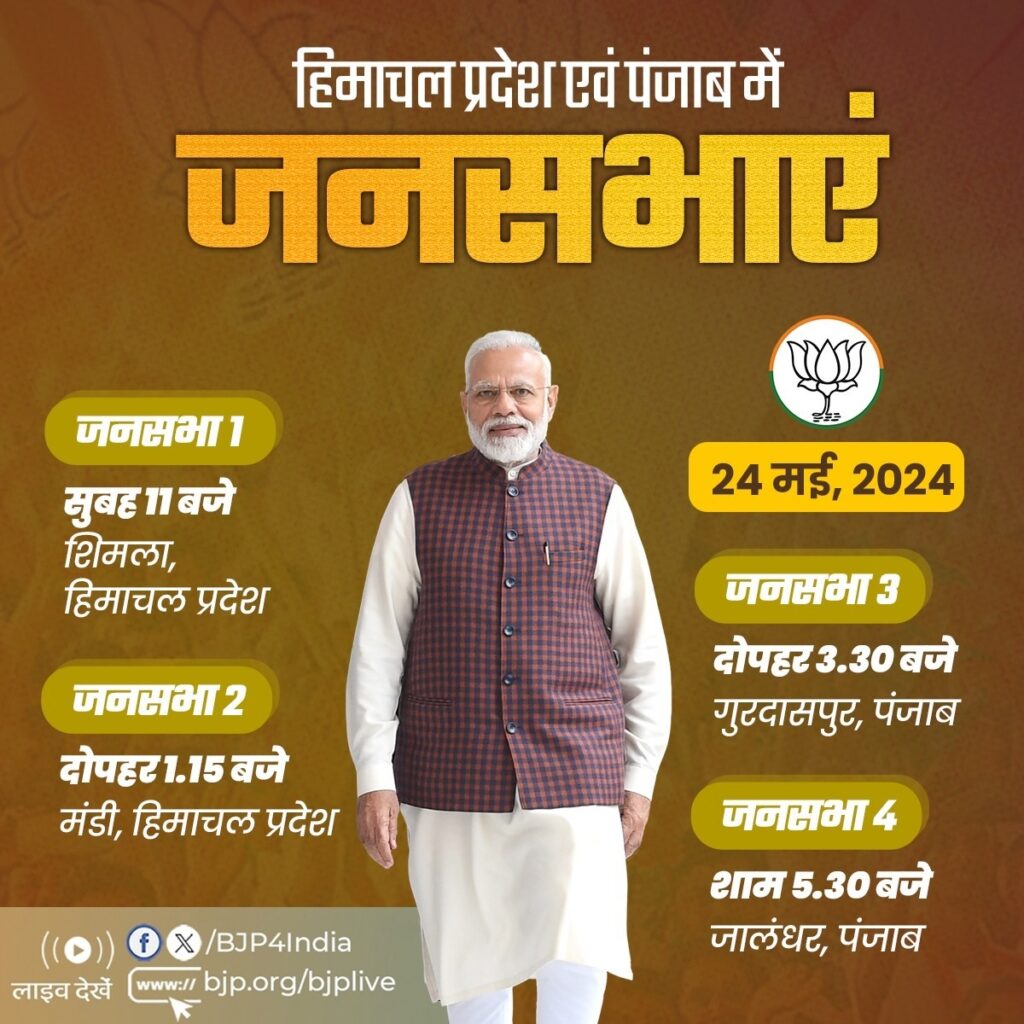 नई दिल्ली, 24 मई । भारतीय जनता पार्टी (भाजपा) के शीर्ष नेता और सबसे बड़े स्टार प्रचारक प्रधानमंत्री नरेन्द्र मोदी आज हिमाचल प्रदेश और पंजाब में चुनाव प्रचार करेंगे। वो हिमाचल प्रदेश में जनसभा को संबोधित करने के साथ आज के प्रचार का श्रीगणेश करेंगे। भाजपा ने प्रधानमंत्री नरेन्द्र मोदी के आज के चुनावी कार्यक्रम को एक्स हैंडल पर साझा किया है।