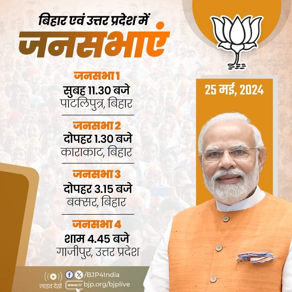 नई दिल्ली, 25 मई । भारतीय जनता पार्टी (भाजपा) के शीर्ष नेता और सबसे बड़े स्टार प्रचारक प्रधानमंत्री नरेन्द्र मोदी आज बिहार और उत्तर प्रदेश में चुनाव प्रचार करेंगे। वो बिहार में जनसभा को संबोधित करने के साथ आज के प्रचार का श्रीगणेश करेंगे। भाजपा ने प्रधानमंत्री नरेन्द्र मोदी के आज के चुनावी कार्यक्रम को एक्स हैंडल पर साझा किया है।