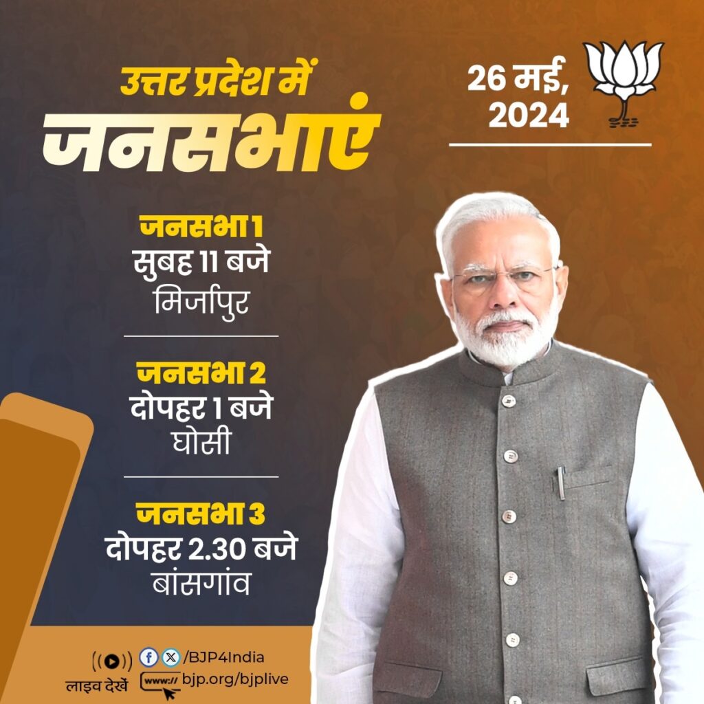 प्रधानमंत्री मोदी इस बार के आम चुनाव में अपने 400 पार के संकल्प की सिद्धि के लिए देश में धुआंधार प्रचार कर मतदाताओं से आशीर्वाद ले रहे हैं। भाजपा के एक्स हैंडल के अनुसार प्रधानमंत्री मोदी आज सबसे पहले सुबह 11 बजे मिर्जापुर, दोपहर एक बजे घोसी और दोपहर 2ः30 बजे बांसगांव में भाजपा की जनसभा को संबोधित करेंगे।