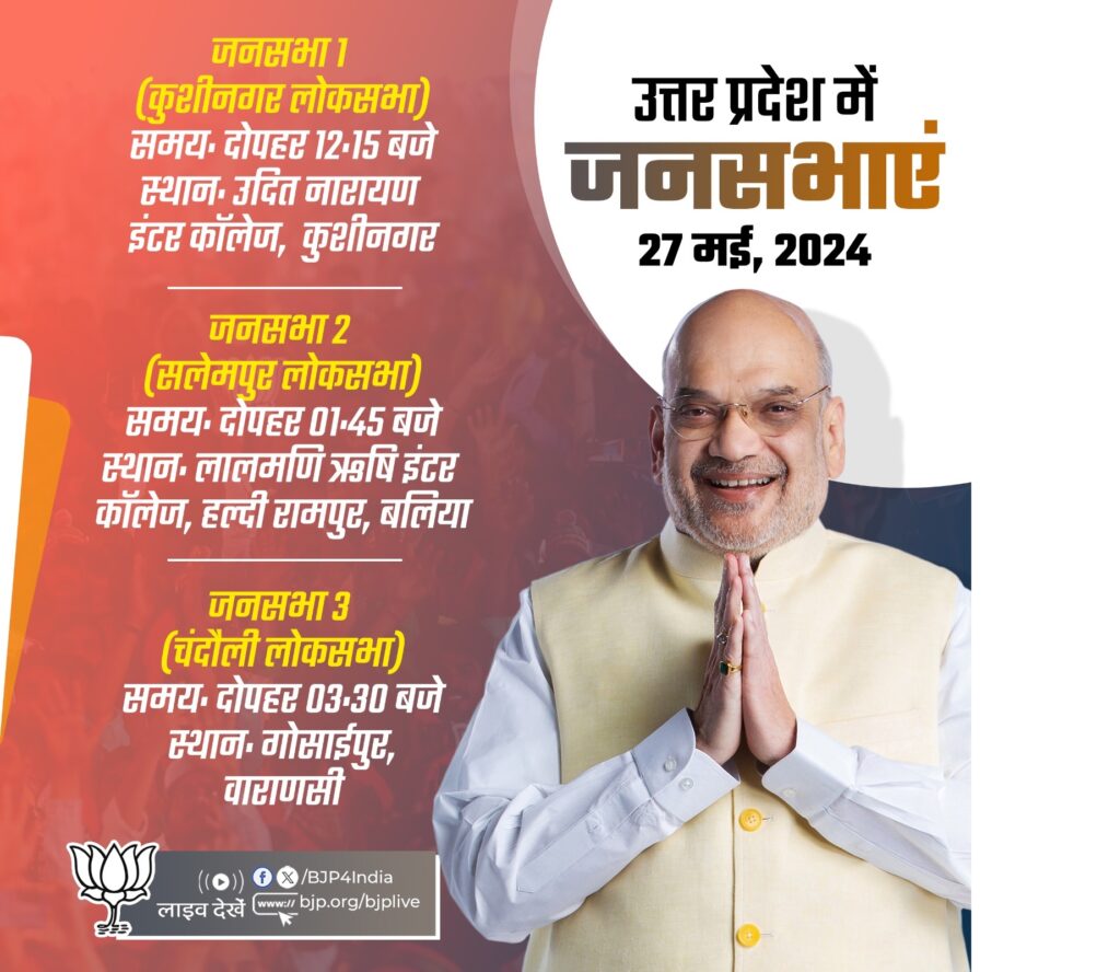 भाजपा के एक्स हैंडल के अनुसार, स्टार प्रचारक शाह कुशीनगर लोकसभा क्षेत्र से आज के चुनाव प्रचार का श्रीगणेश करेंगे। वो दोपहर 12ः15 बजे उदित नारायण इंटर कालेज कुशीनगर में भाजपा की जनसभा को संबोधित करेंगे। इसके बाद सलेमपुर लोकसभा क्षेत्र पहुंचेंगे। वो यहां दोपहर पौने दो बजे लालमणि ऋषि इंटर कालेज हल्दी रामपुर (बलिया) में जनसभा को संबोधित करने के बाद चंदौसी लोकसभा क्षेत्र में चुनाव प्रचार के लिए पहुंचेंगे। शाह इस निर्वाचन क्षेत्र में अपराह्न साढ़े तीन बजे गोंसाईपुर (वाराणसी) में जनसभा को संबोधित करेंगे।