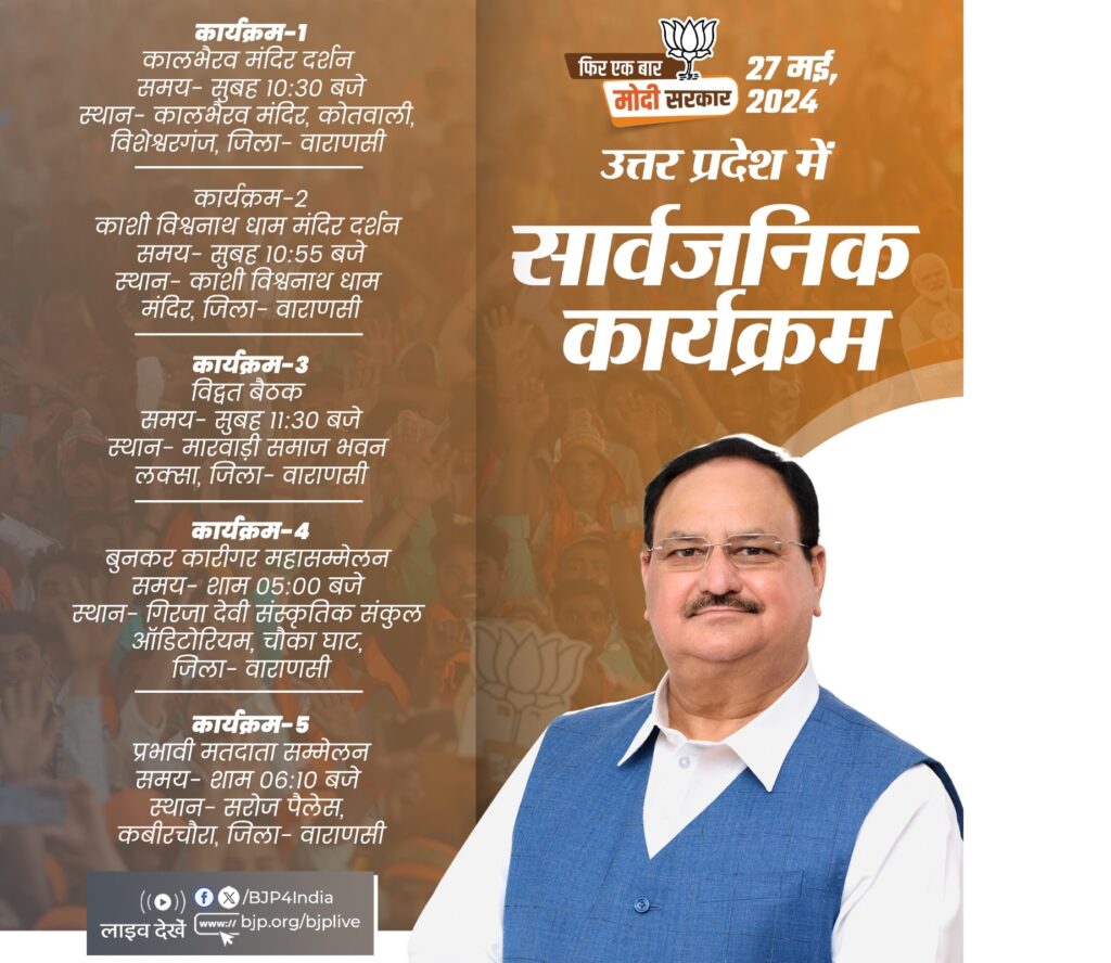 भाजपा के एक्स हैंडल के अनुसार नड्डा आज सुबह सबसे पहले 10ः30 बजे वाराणसी में कालभैरव मंदिर में दर्शन के लिए जाएंगे। इसके 25 मिनट बाद नड्डा काशी विश्वनाथधाम मंदिर के दर्शन करेंगे। पूजा-अर्चना के बाद भाजपा नेता नड्डा लक्सा पहुंचेंगे। लक्सा के मारवाड़ी समाज भवन में सुबह 11ः30 बजे विद्वत बैठक में हिस्सा लेंगे। शाम को भाजपा ने चौकाघाट में बुनकर कारीगर सम्मेलन आहूत किया है। नड्डा शाम पांच बजे बुनकरों को संबोधित करेंगे। नड्डा शाम 6ः10 बजे होने वाले प्रभावी मतदाता सम्मेलन में भी हिस्सा लेंगे। यह सम्मेलन कबीर चौरा स्थित सरोज पैलेस में होगा।