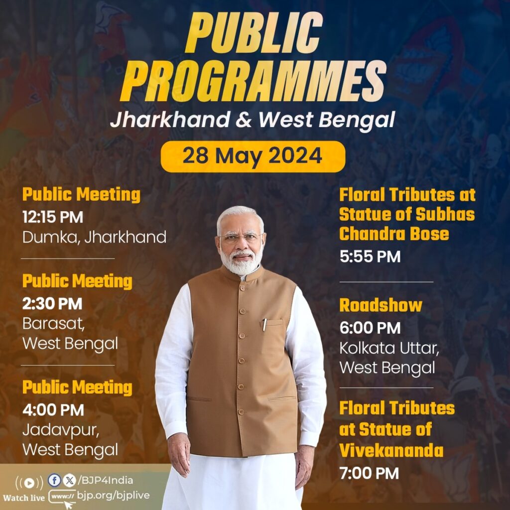 नई दिल्ली, 28 मई । भारतीय जनता पार्टी (भाजपा) के शीर्ष नेता और सबसे बड़े स्टार प्रचारक प्रधानमंत्री नरेन्द्र मोदी आज देश के दो राज्यों झारखंड और पश्चिम बंगाल में चुनाव प्रचार करेंगे। वो झारखंड के दुमका में जनसभा को संबोधित करने के साथ आज के प्रचार का श्रीगणेश करेंगे। भाजपा ने अपने सबसे बड़े और लोकप्रिय स्टार प्रचारक प्रधानमंत्री नरेन्द्र मोदी के आज के चुनावी कार्यक्रम को एक्स हैंडल पर साझा किया है।