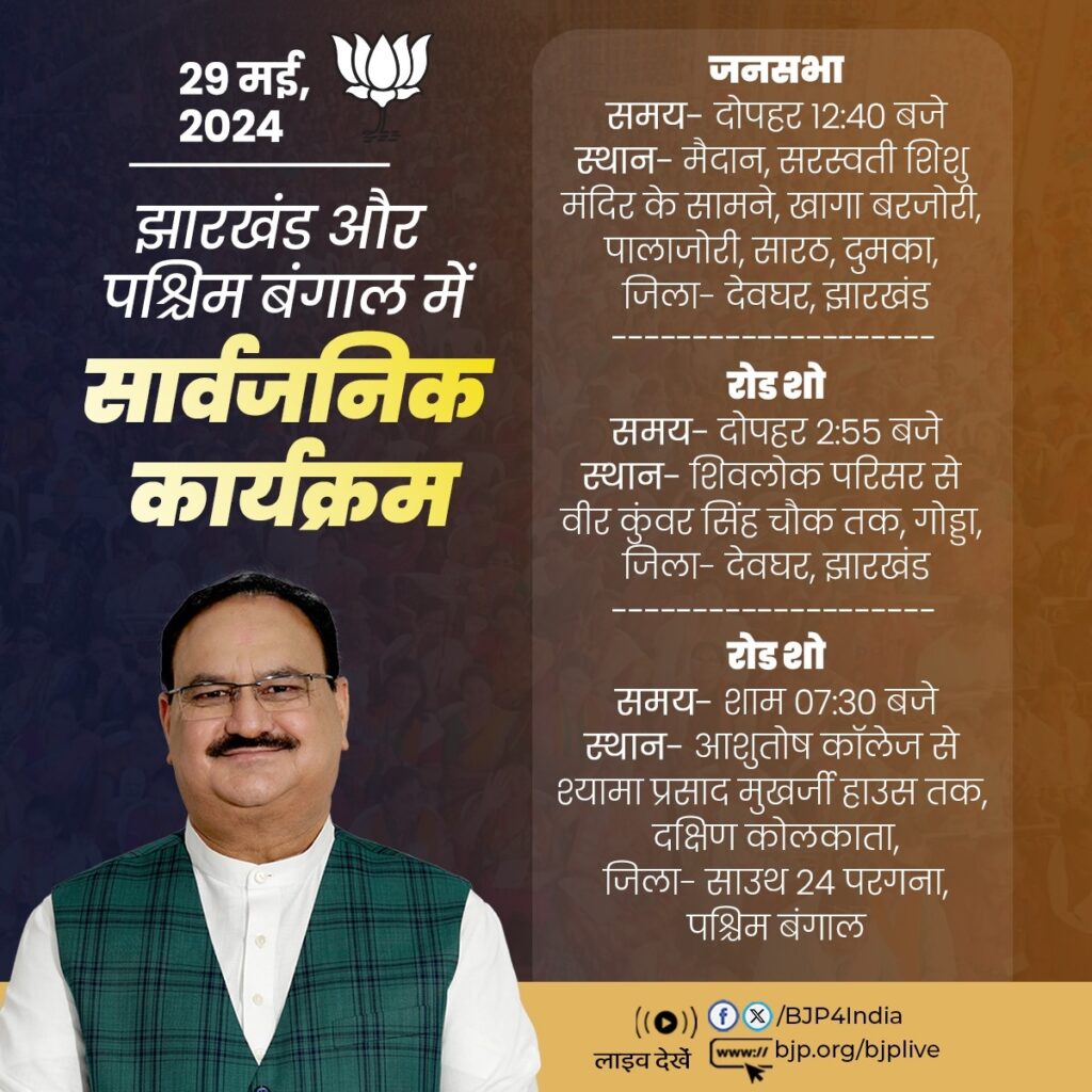 भाजपा के एक्स हैंडल के अनुसार नड्डा आज दोपहर सवा 12ः40 बजे झारखंड में जिला देवघर के खागा बरजोरी में जनसभा को संबोधित करेंगे। यहां से वो इसी जिले को गोड्डा का रुख करें। गोड्डा में उनका रोड शो दोपहर 2ः55 बजे शुरू होगा। गोड्डा से वो पश्चिम बंगाल की राजधानी कोलकाता पहुंचेंगे। दक्षिण कोलकाता में शाम साढ़े सात बजे वो रोड शो का नेतृत्व करेंगे।