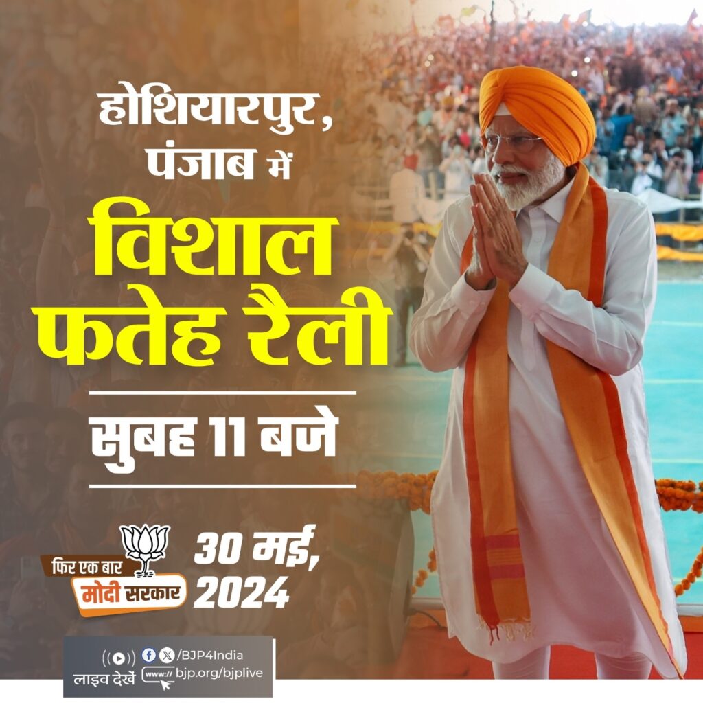 प्रधानमंत्री मोदी ने इस बार के आम चुनाव में अपने 400 पार के संकल्प की सिद्धि के लिए सारे देश में धुआंधार प्रचार कर मतदाताओं का आशीर्वाद लिया। आज वो पंजाब के होशियारपुर में मतदाताओं का आशीर्वाद लेकर कन्याकुमारी के लिए रवाना होंगे। भाजपा के एक्स हैंडल के अनुसार प्रधानमंत्री मोदी आज सुबह 11 बजे पंजाब के होशियारपुर में विशाल फतेह रैली को संबोधित करेंगे। उल्लेखनीय है कि पहली जून को सातवें चरण का मतदान होना है।