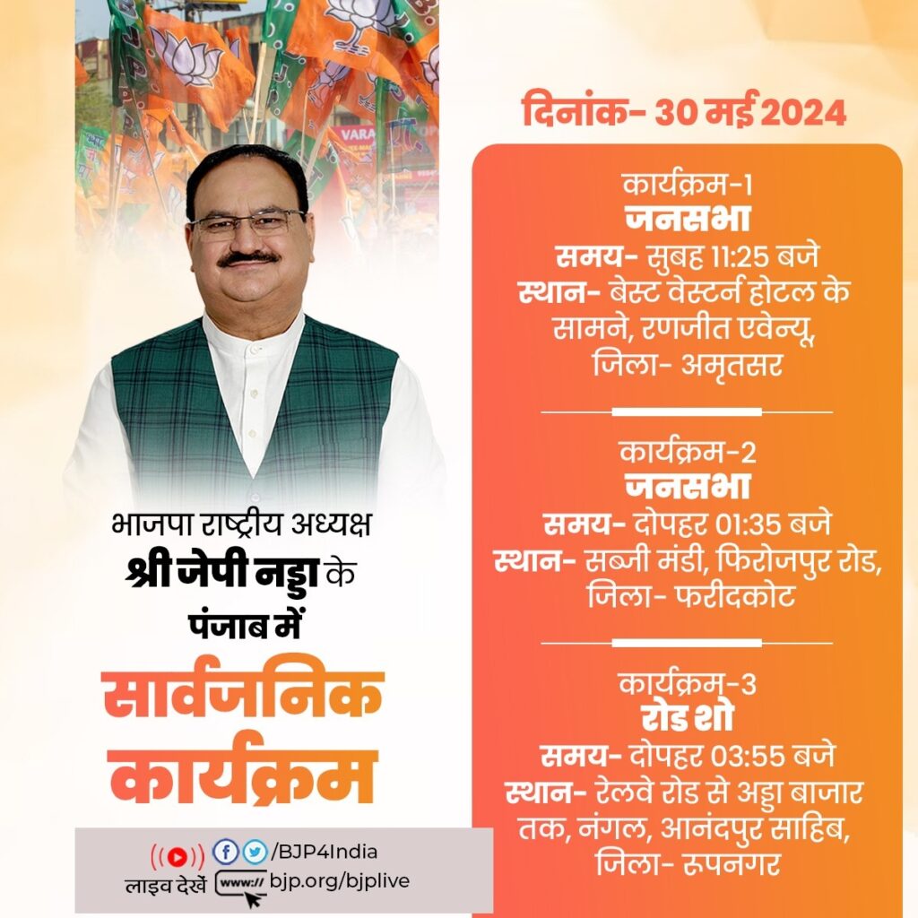 भाजपा के एक्स हैंडल के अनुसार नड्डा आज सुबह 11ः25 बजे बजे अमृतसर और दोपहर 1ः35 बजे जिला फरीदकोट में जनसभाओं को संबोधित करेंगे। आखिर में शाम ढलने से पहले 3ः55 बजे रूपनगर जिले में प्रचार करेंगे। यहां वो रोड शो करेंगे। यह रोड शो रेलवे रोड से गुजरता हुआ आनंदपुर साहिब के नंगल में अड्डा बाजार पर पूर्ण होगा।