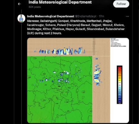विभाग ने कहा है कि अगले दो घंटे में उत्तरी दिल्ली, उत्तर-पूर्वी दिल्ली, उत्तर-पश्चिम दिल्ली, पश्चिमी दिल्ली, मध्य दिल्ली, एनसीआर (लोनी देहात, हिंडन एयर फोर्स स्टेशन, बहादुरगढ़, गाजियाबाद, इंदिरापुरम), छपरौला सोनीपत, रोहतक, खरखौदा (हरियाणा), बागपत, खेकड़ा, मोदीनगर, पिलखुआ (उत्तर प्रदेश) के कुछ स्थानों और आसपास के क्षेत्रों में हल्की से मध्यम तीव्रता की बारिश और हवाएं चलेंगी।