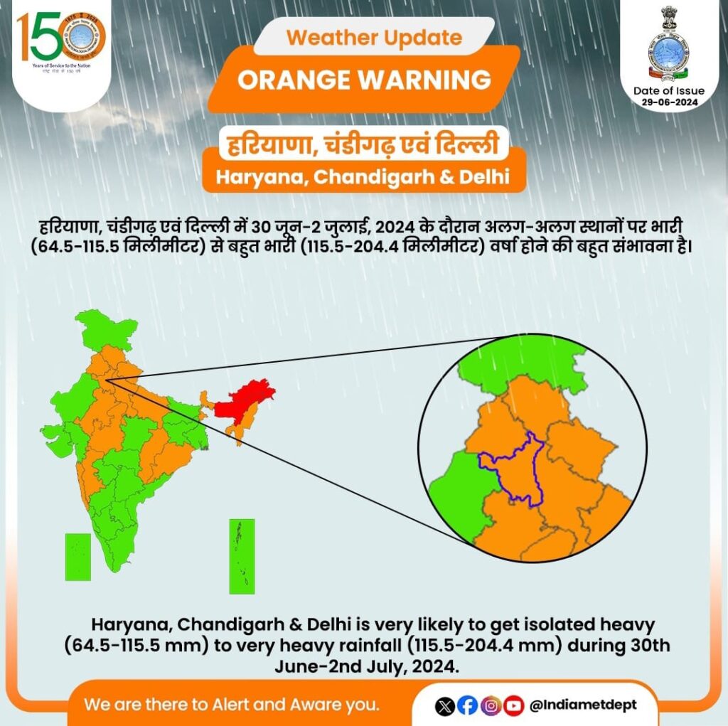 मौसम विभाग ने 2 जुलाई तक हरियाणा, चंडीगढ़ के साथ पंजाब, हिमाचल प्रदेश के लिए भी ऑरेंज अलर्ट जारी किया है। इसके साथ असम एवं मेघालय में 29 जून के लिए रेल अलर्ट जारी किया है। इन दोनों राज्यों में अत्यंत भारी बारिश की संभावना जताई है।