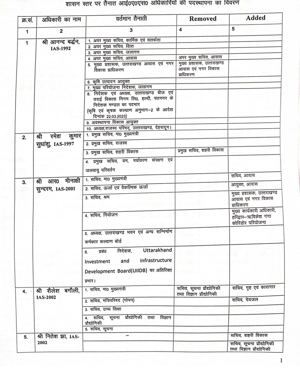 मंगलवार रात्रि जारी स्थान्तरण आदेश में अपर मुख्य सचिव आनंद बर्धन से अपर मुख्य सचिव आवास और हटा दिया गया है। सचिव मीनाक्षी सुंदरम को वर्तमान दायित्व के साथ सचिव, आवास,आयुक्त, आवास, मुख्य प्रशासक, उत्तराखण्ड आवास एवं नगर विकास प्राधिकरण, मुख्य कार्यकारी अधिकारी, हरिद्वार-ऋषिकेश गंगा कोरिडोर परियोजना की जिम्मेदारी दी गई है।