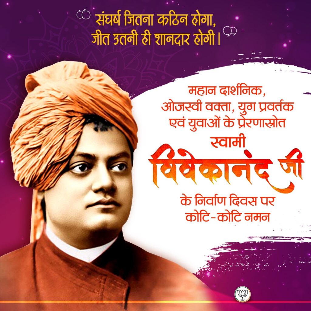 भाजपा ने एक्स पर लिखा है-”महान दार्शनिक, ओजस्वी वक्ता, युग प्रवर्तक एवं युवाओं के प्रेरणास्रोत स्वामी विवेकानंद जी के निर्वाण दिवस पर कोटि-कोटि नमन।” उल्लेखनीय है कि स्वामी विवेकानंद ने अपने गुरु की उक्ति ‘जीव ही शिव है’ को अपने जीवन में उतारते हुए उद्धृत करते हुए सुझाव दिया कि ईश्वर हर जीवित प्राणी में है और हमें जाति, वर्ग, लिंग, धर्म या जातीयता के बावजूद हर व्यक्ति का सम्मान करना चाहिए।