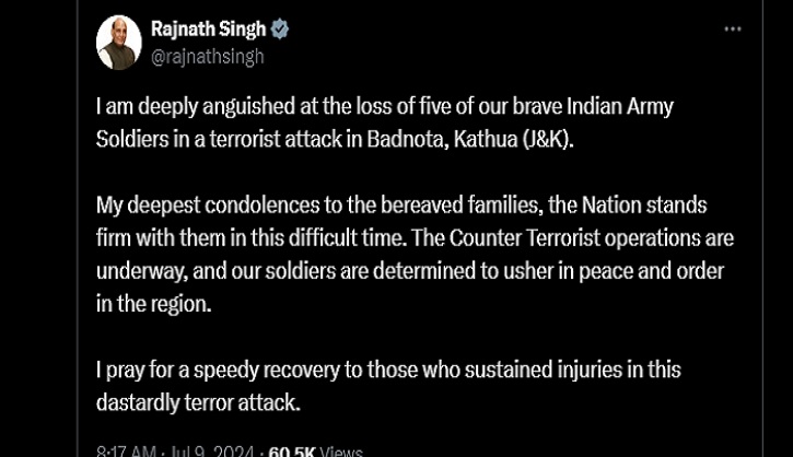 नई दिल्ली, 09 जुलाई । रक्षामंत्री राजनाथ सिंह ने जम्मू-कश्मीर में आतंकी हमले में पांच भारतीय सैनिकों के बलिदान पर गहरा शोक जताया है। उन्होंने एक्स हैंडल में लिखा है, ”बदनोटा, कठुआ (जम्मू-कश्मीर) में आतंकवादी हमले में अपने पांच बहादुर भारतीय सैनिकों के बलिदान से मुझे गहरा दुख हुआ है। ”