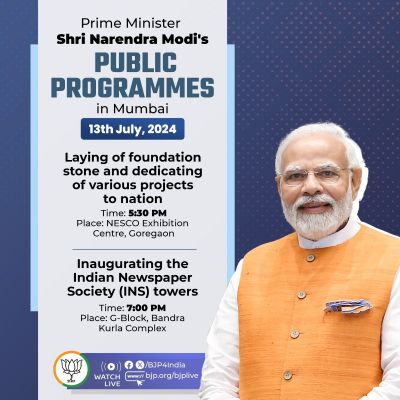 नई दिल्ली, 13 जुलाई । प्रधानमंत्री नरेन्द्र मोदी आज देश की आर्थिक राजधानी मुंबई ( महाराष्ट्र) का दौरा करेंगे। इस दौरान प्रधानमंत्री मोदी अनेक परियोजनाओं का शुभारंभ करेंगे। भारतीय जनता पार्टी (भाजपा) ने प्रधानमंत्री नरेन्द्र मोदी के मुंबई दौरे का संक्षिप्त विवरण एक्स पर साझा किया है। साथ ही भारत सरकार के पत्र सूचना कार्यालय (पीआईबी) ने कार्यक्रम की विस्तृत जानकारी विज्ञप्ति में उपलब्ध कराई है।