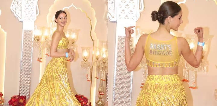 अनंत-राधिका की शादी में एक्ट्रेस अनन्या पांडे शामिल हुई हैं। अनन्या ने अनंत-राधिका के संगीत समारोह से लेकर हलाद, मेहंदी तक कई कार्यक्रमों और अनुष्ठानों में भाग लिया था । साथ ही कई प्री-वेडिंग इवेंट में बॉलीवुड के कई कलाकार शामिल हुए। अनंत-राधिका की शादी में अनन्या ने पीले रंग का डिजाइनर लहंगा पहना था। इस लुक में अनन्या का वीडियो इस समय सोशल मीडिया पर वायरल हो रहा है। इस आउटफिट में एक चीज जिसने सबका ध्यान खींचा वो ये कि अनन्या के क्रॉप टॉप के पीछे ‘अनंत ब्रिगेड’ लिखा हुआ था। लगता है अनन्या ने ये कस्टमाइज आउटफिट खासतौर पर इसी शादी के लिए बनवाया है।