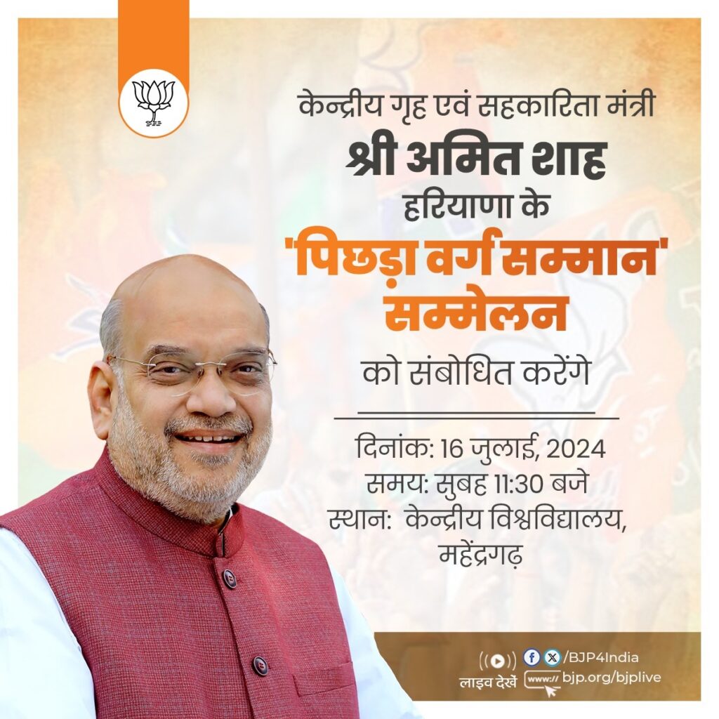 भारतीय जनता पार्टी (भाजपा) ने केंद्रीय गृह एवं सहकारितामंत्री अमित शाह के महेंद्रगढ़ के कार्यक्रम का संक्षिप्त विवरण एक्स पर साझा किया है। भाजपा के अनुसार अमित शाह महेंद्रगढ़ में पिछड़ा वर्ग सम्मान सम्मेलन को सुबह 10 बजे संबोधित करेंगे। यह कार्यक्रम महेंद्रगढ़ के केंद्रीय विश्वविद्यालय पाली में होगा।