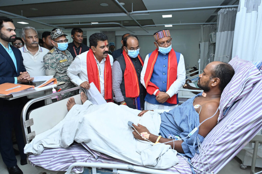 रायपुर,19 जुलाई । मुख्यमंत्री विष्णु देव साय अपने दिल्ली दौरे से गुरुवार की देर रात लौटने के तुरंत बाद बीजापुर जिले के तर्रेम क्षेत्र में माओवादियों द्वारा किए गए आईईडी ब्लास्ट में घायल एसटीएफ के चार जवानों को देखने रामकृष्ण केयर हॉस्पिटल पहुंचे। इस दौरान उपमुख्यमंत्री अरूण साव और विजय शर्मा भी साथ थे।