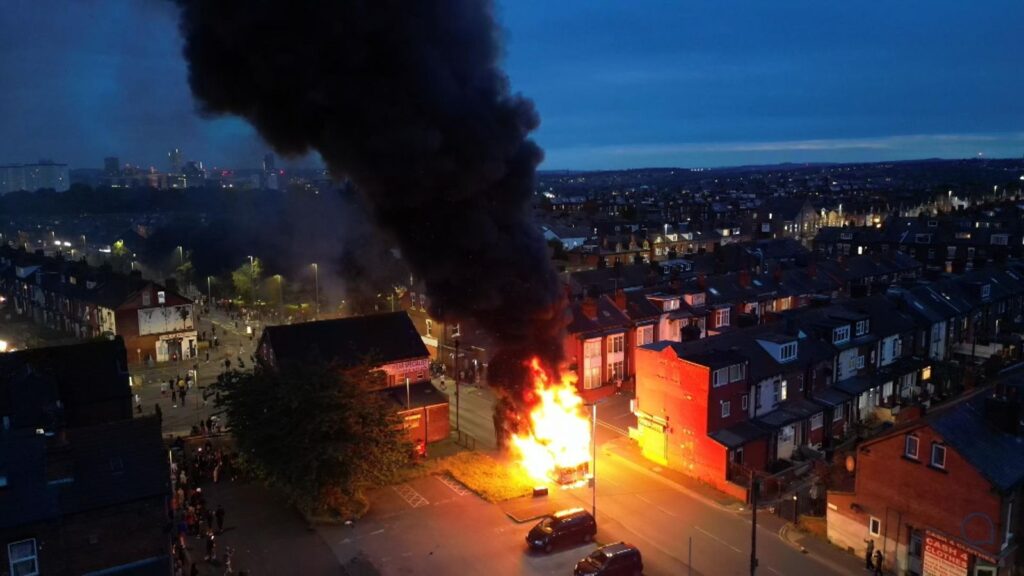 लंदन, 19 जुलाई । संसदीय चुनाव के बाद ब्रिटेन में हिंसा की चिंगारी भड़क उठी है। लीड्स के हेयर हिल्स में हुए दंगे की डरावनी तसवीरें सामने आई हैं। दंगों का सबसे ज्यादा कहर सड़कों पर बरपा है। बेखौफ दंगाइयों ने पुलिस की गाड़ियों में तोड़फोड़ कर कई जगह आगजनी की। बसें फूंक दी हैं। उपद्रवियों ने एक बस में आग लगा दी और पुलिस की गाड़ी को पलट दिया। पुलिस ने हालात की गंभीरता को देखते हुए नागरिकों से घरों में रहने की अपील की है। समूचे हेयर हिल्स में भारी पुलिस बल तैनात किया गया है। अभी तक किसी के हताहत होने की सूचना नहीं है।