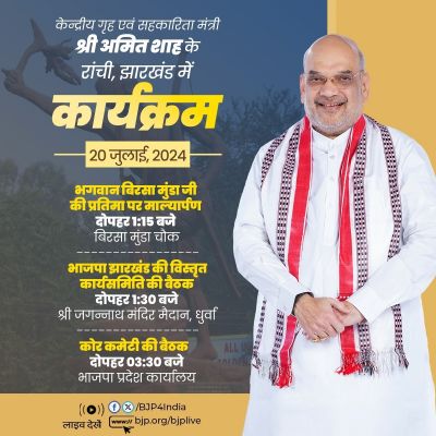 भाजपा के एक्स हैंडल के अनुसार, शाह सबसे पहले दोपहर एक बजे बिरसा मुंडा चौक पहुंचेंगे। वो यहां भगवान बिरसा मुंडा की प्रतिमा पर माल्यार्पण करेंगे। इसके बाद श्री जगन्नाथ मंदिर मैदान धुर्वा जाएंगे। धुर्वा में दोपहर डेढ़ बजे भाजपा झारखंड की विस्तृत कार्यक्रम समिति की बैठक में हिस्सा लेंगे। इसके बाद केंद्रीयमंत्री शाह कोर कमेटी की बैठक को संबोधित करेंगे। यह बैठक प्रदेश भाजपा कार्यालय में अपराह्न साढ़े तीन बजे शुरू होगी।