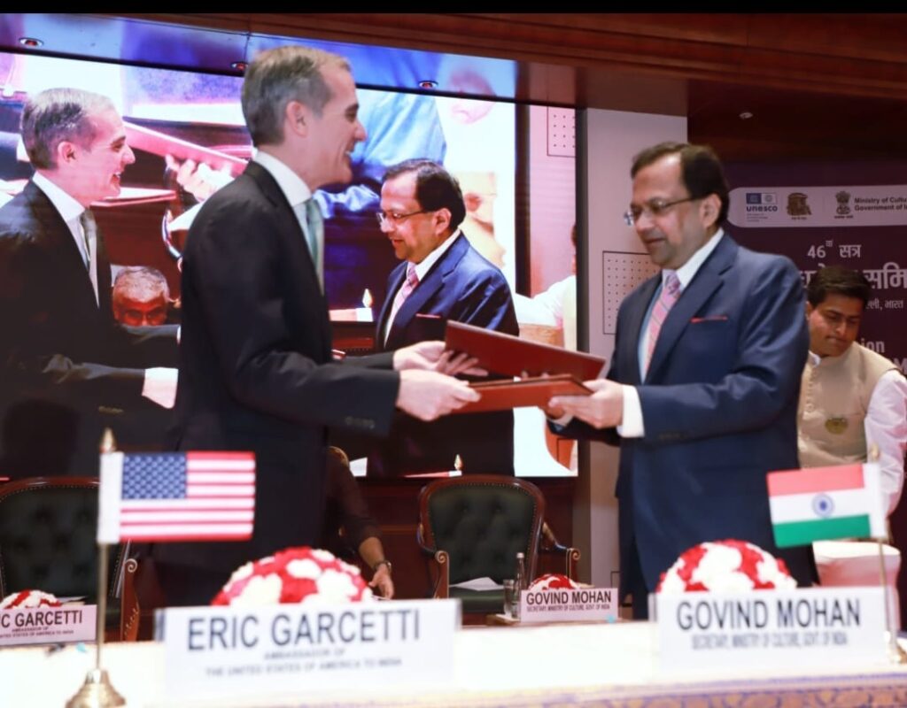 नई दिल्ली, 26 जुलाई । भारत और अमेरिका ने शुक्रवार को सांस्कृतिक संपत्तियों की बहाली एवं सुरक्षा तथा चुराई गई भारतीय पुरावशेषों की तस्करी को रोकने के लिए पहली बार द्विपक्षीय समझौते पर हस्ताक्षर किए। यहां भारत मंडपम में आयोजित 46वें विश्व धरोहर समिति की बैठक में आयोजित समझौता ज्ञापन हस्ताक्षर के अवसर पर केंद्रीय संस्कृति एवं पर्यटन मंत्री गजेंद्र सिंह शेखावत, सचिव गोविंद मोहन और भारत में अमेरिकी राजदूत एरिक गार्सेटी उपस्थित थे।