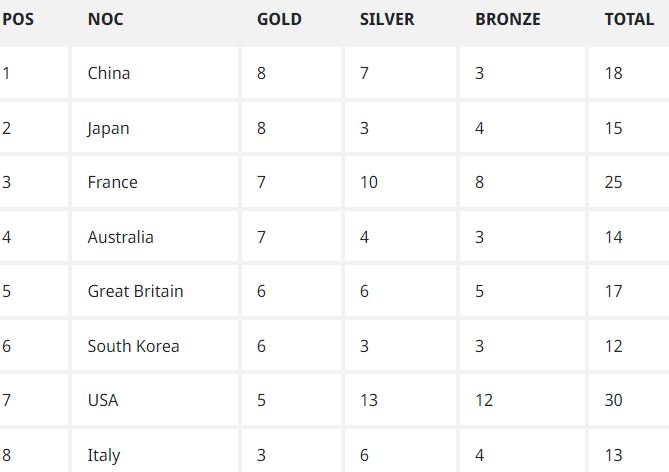 तालिका में ऑस्ट्रेलिया 7 स्वर्ण, 4 रजत और 3 कांस्य सहित कुल 14 पदकों के साथ चौथे और ग्रेट ब्रिटेन 6, स्वर्ण, 6 रजत और 5 कांस्य सहित कुल 17 पदकों के साथ पांचवें स्थान पर है।