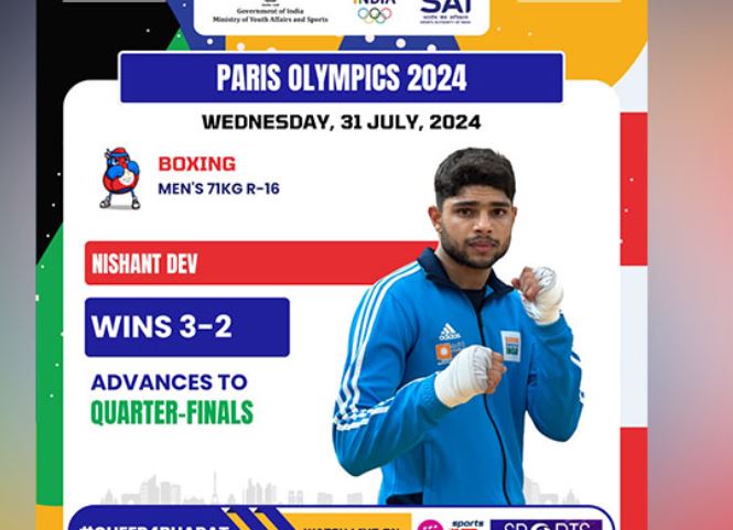 पेरिस, 1 अगस्त । भारतीय मुक्केबाज निशांत देव ने क्वार्टर फाइनल में अपनी जगह पक्की कर ली, जबकि पैडलर श्रीजा अकुला चल रहे पेरिस ओलंपिक में महिला एकल स्पर्धा में बाहर होकर इतिहास रचने में नाकाम रहीं।