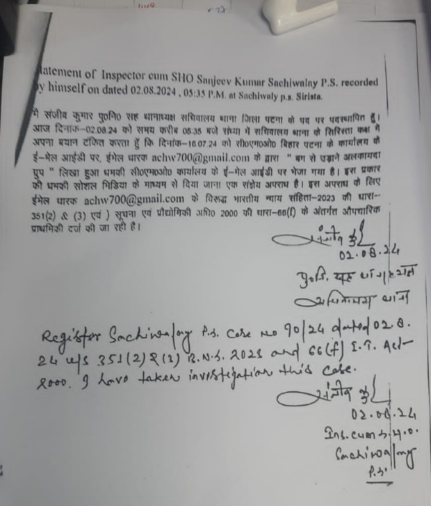 पटना के वरीय पुलिस अधीक्षक (एसएसपी) राजीव मिश्रा ने बताया कि यह मामला पुराना है लेकिन हमने जांच के बाद दो अगस्त को एफआईआर दर्ज की है। उन्होंने कहा कि इस मामले में अज्ञात व्यक्तियों के खिलाफ मुकदमा दर्ज किया गया है। फिलहाल पुलिस इसकी छानबीन कर रही है।