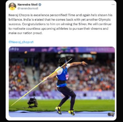 प्रधानमंत्री मोदी ने लिखा है, “नीरज चोपड़ा उत्कृष्टता के साक्षात उदाहरण हैं। उन्होंने बार-बार अपनी प्रतिभा दिखाई है। भारत को खुशी है कि वह एक बार फिर ओलंपिक में सफल रहे हैं। रजत पदक जीतने पर उन्हें बधाई। वह आने वाले अनगिनत एथलीटों को अपने सपनों को पूरा करने और हमारे देश को गौरवान्वित करने के लिए प्रेरित करते रहेंगे।”