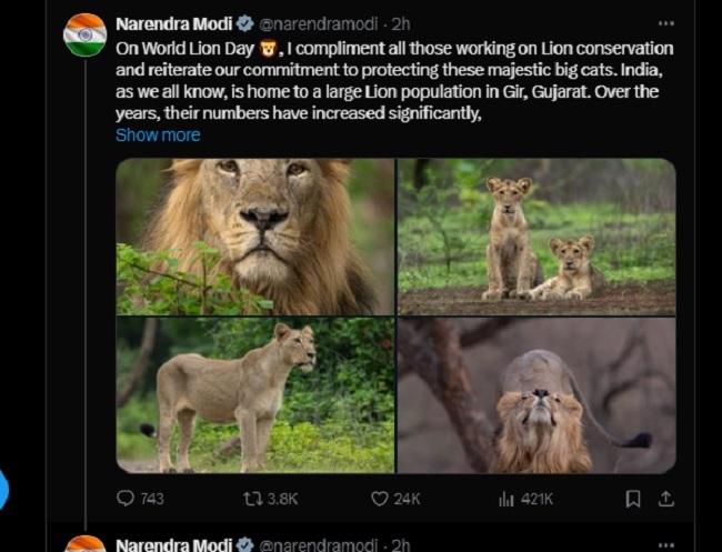 प्रधानमंत्री मोदी ने सभी वन्यजीवप्रेमियों को गिर राष्ट्रीय उद्यान की यात्रा और गुजरात के लोगों के आतिथ्य का अनुभव करने करने के साथ शेर की रक्षा के लिए किए गए प्रयासों को देखने के लिए आमंत्रित किया है। प्रधानमंत्री मोदी ने लिखा है, ”विश्व शेर दिवस पर मैं शेर संरक्षण के लिए काम करने वाले सभी लोगों की सराहना करता हूं और इन राजसी बड़ी बिल्लियों की रक्षा करने की अपनी प्रतिबद्धता दोहराता हूं। भारत, जैसा कि हम सभी जानते हैं, गिर, गुजरात में एक बड़ी शेर आबादी का घर है। इन वर्षों में उनकी संख्या में काफी वृद्धि हुई है, जो बहुत अच्छी खबर है।”