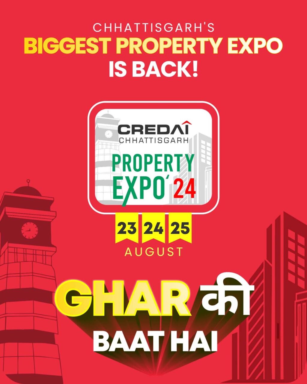 बेस्ट प्रापर्टी के लिए बेस्ट डील्स करने का यह सबसे अच्छा अवसर होगा। तीनों ही दिन स्पाट बुकिंग पर कई सारे आफर्स पाने का भी मौका मिलेगा। क्रेडाई छत्तीसगढ़ ने इस बार अपने प्रॉपर्टी एक्सपो का थीम रखा है – ‘घर की बात है’।