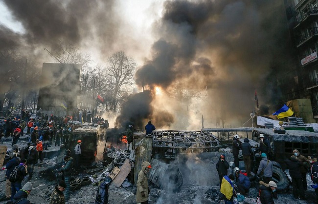 epa04040718 Protesters attend an anti-government protest in downtown Kiev, Ukraine, 25 January 2014. Ukraine has been convulsed by protests led by pro-European activists incensed that President Viktor Yanukovych opted against an association agreement with the European Union in November, choosing closer relations with Russia instead. According to media reports on 25 January, more fighting was reported overnight in Kiev, with demonstrators throwing rocks and flaming objects at security forces. EPA/SERGEY DOLZHENKO +++(c) dpa - Bildfunk+++
