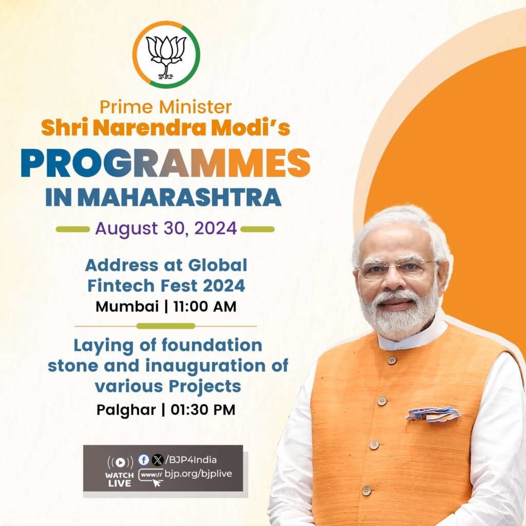 नई दिल्ली, 30 अगस्त। प्रधानमंत्री नरेन्द्र मोदी आज महाराष्ट्र की राजधानी मुंबई और पालघर के दौरे पर रहेंगे। वो सुबह 11 बजे मुंबई के जियाे वर्ल्ड कन्वेंशन सेंटर में ग्लोबल फिनटेक फेस्ट-2024 को संबोधित करेंगे। इसके बाद दोपहर करीब डेढ़ बजे पालघर के सिडको मैदान में विभिन्न विकास परियोजनाओं का उद्घाटन और शिलान्यास करेंगे। भारतीय जनता पार्टी (भाजपा) ने प्रधानमंत्री मोदी के आज के महाराष्ट्र दौरे के कार्यक्रम को एक्स हैंडल पर साझा किया है।