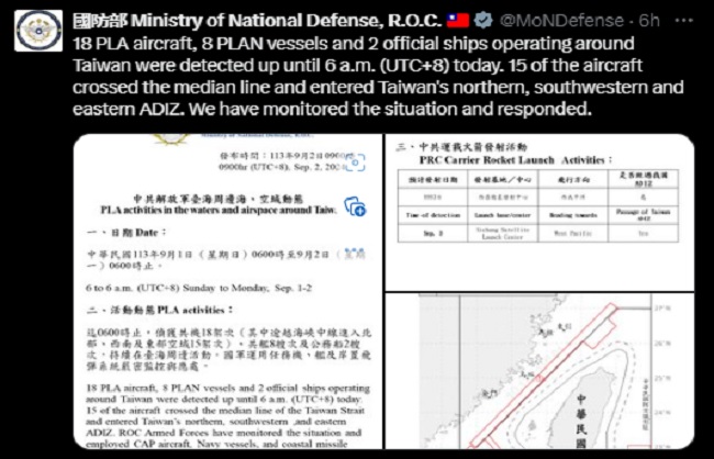 ताइपे, 02 सितंबर । चीन पिछले 24 घंटे से ताइवान के खिलाफ आक्रामक रुख अपनाए हुए है। ताइवान के रक्षा मंत्रालय ने आज एक्स हैंडल पोस्ट में कहा है कि चीन की सेना के लड़ाकू विमान और युद्धक जहाज उसकी सीमा के आसपास मंडरा रहे हैं।