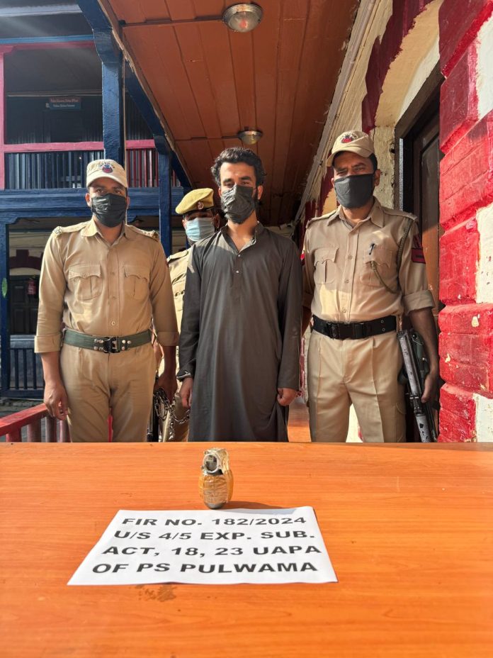 पुलवामा, 5 सितंबर । नाका पार्टी पर हमले की साजिश को नाकाम कर गुरुवार काे पुलिस ने करीमाबाद क्रॉसिंग पर चेकिंग के दौरान आतंकियों के एक सहयोगी को गिरफ्तार किया है। उसके पास से हथगोला बरामद किया गया है। आरोपित की पहचान करीमाबाद निवासी अरसलान अहमद शेख के रूप में हुई है।