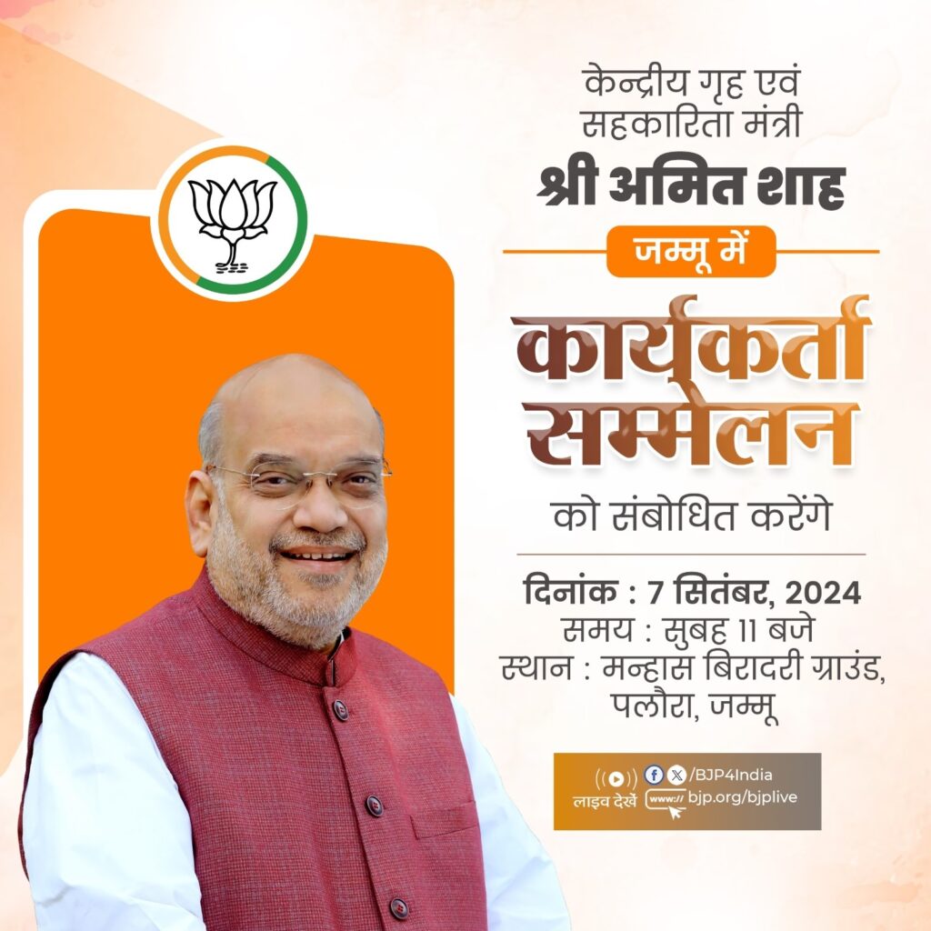 नई दिल्ली, 07 सितंबर। केन्द्रीय गृह एवं सहकारितामंत्री और भारतीय जनता पार्टी के वरिष्ठ नेता अमित शाह जम्मू-कश्मीर में कार्यकर्ता सम्मेलन को संबोधित करेंगे। भाजपा ने शाह के कार्यक्रम को एक्स हैंडल में साझा किया है। पार्टी के स्टार प्रचारक और प्रमुख रणनीतिकार शाह कल से जम्मू में हैं।