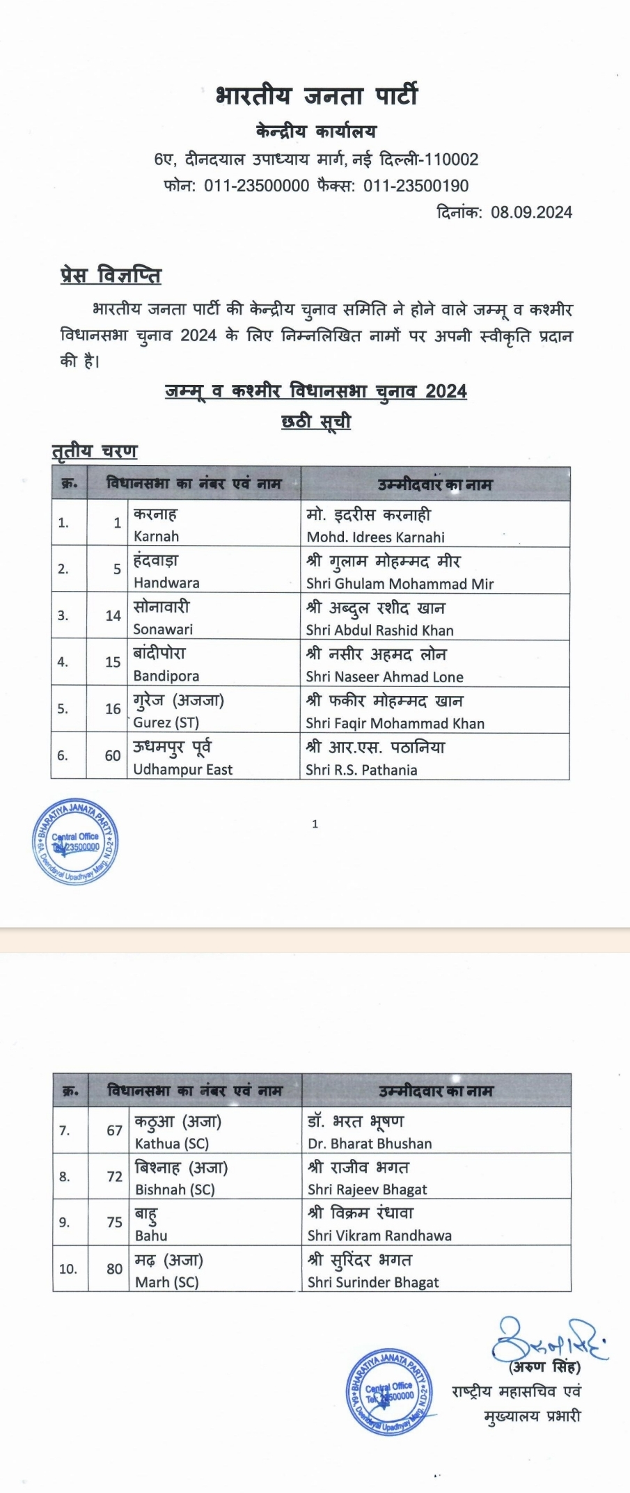 नई दिल्ली, 08 सितंबर । भाजपा ने रविवार को जम्मू-कश्मीर विधानसभा चुनाव के लिए छठी सूची में जारी की। इसमें 10 उम्मीदवारों के नाम शामिल हैं।