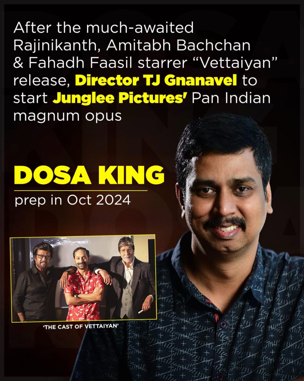 मेगास्टार रजनीकांत, अमिताभ बच्चन और फहद फासिल स्टारर ‘वेट्टैयान’ की बहुप्रतीक्षित रिलीज़ के बाद अब प्रशंसित निर्देशक टीजे ज्ञानवेल 10 अक्टूबर को जंगली पिक्चर्स की डोसा किंग के साथ एक और सिनेमैटिक मैग्नम ओपस लेकर आने को तैयार हैं। राजी जैसी पसंदीदा फ़िल्में बनाने के लिए जाने जाने वाले, जंगली पिक्चर्स ने इस एपिक कहानी को बड़े पर्दे पर लाने के लिए ज्ञानवेल के साथ मिलकर काम किया है। टीजे ज्ञानवेल और हेमंत राव द्वारा लिखी गई ये पैन-इंडिया फ़िल्म जीवाजोती और पी. राजगोपाल के एपिक क्लैश से प्रेरित है, जो महत्वाकांक्षा, ताकत और न्याय की लड़ाई के लिए मंच तैयार करती है। जंगली पिक्चर्स ने इस कहानी के एक एक्सक्लूसिव और विस्तृत ऑन-स्क्रीन चित्रण के लिए जीवाजोती संथाकुमार के जीवन अधिकार हासिल किए हैं।