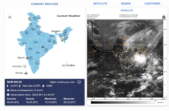मौसम विज्ञान विभाग का पूर्वानुमान है कि आज दिल्ली में दिन भर बादल छाए रहेंगे। अधिकांश हिस्सों में बारिश होती रहेगी। इस दौरान 25 से 35 किलोमीटर प्रति घंटे की रफ्तार से हवा चल सकती है। अधिकतम तापमान 31 और न्यूनतम 21 डिग्री सेल्सियस रह सकता है। विभाग का कहना है कि देश को अगले सप्ताह से कुछ राहत मिलेगी। मौसम विज्ञानियों का मानना है कि दक्षिण-पश्चिम मानसून 19 से 25 सितंबर के बीच देश से लौटने लगेगा।यह आमतौर पर पहली जून तक केरल में प्रवेश करता है और आठ जुलाई तक पूरे देश में पहुंच जाता है। यह 17 सितंबर के आसपास उत्तर-पश्चिम भारत से हटना शुरू हो जाता है। 15 अक्टूबर तक पूरी तरह लौट जाता है।